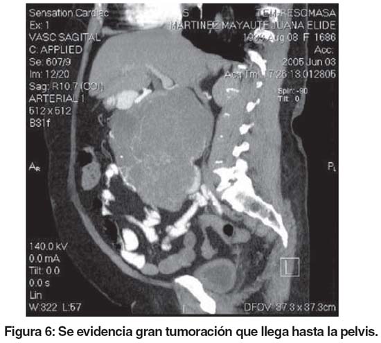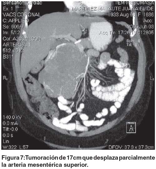 Se solicita una tomografía espiral multicorte, con cortes ultra finos para definir resecabilidad, donde se evidencia tumoración quística gigante de cabeza de páncreas de 17 X 13 X12 cm. que esta en estrecho contacto con la arteria y la vena mesentérica superior en toda su extensión. (Fig.: 5-8) Se programa a la paciente con el diagnostico de cistoadenoma seroso del páncreas.