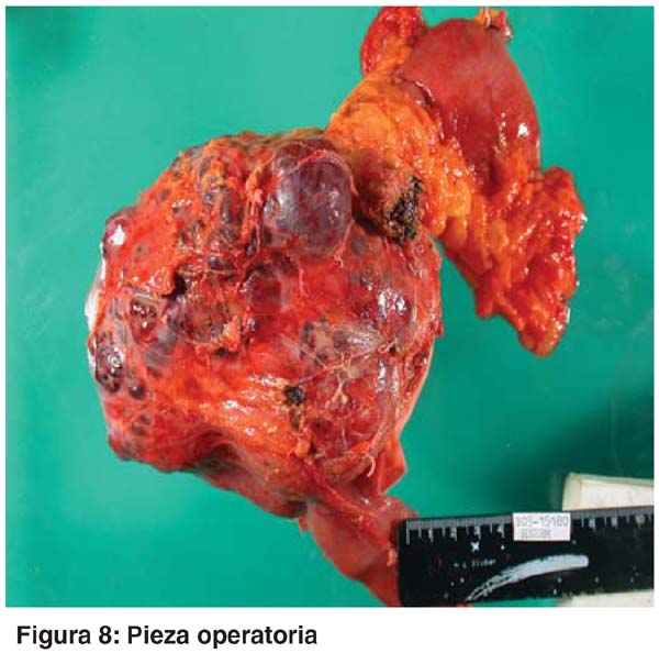 En sala de operaciones se encuentra una gran tumoración que ocupa casi toda la cavidad de consistencia dura, poco móvil muy fija al plano medial con neovascularizacion importante, por lo que se decide efectuarle una duodenopancreatectomia clásica.